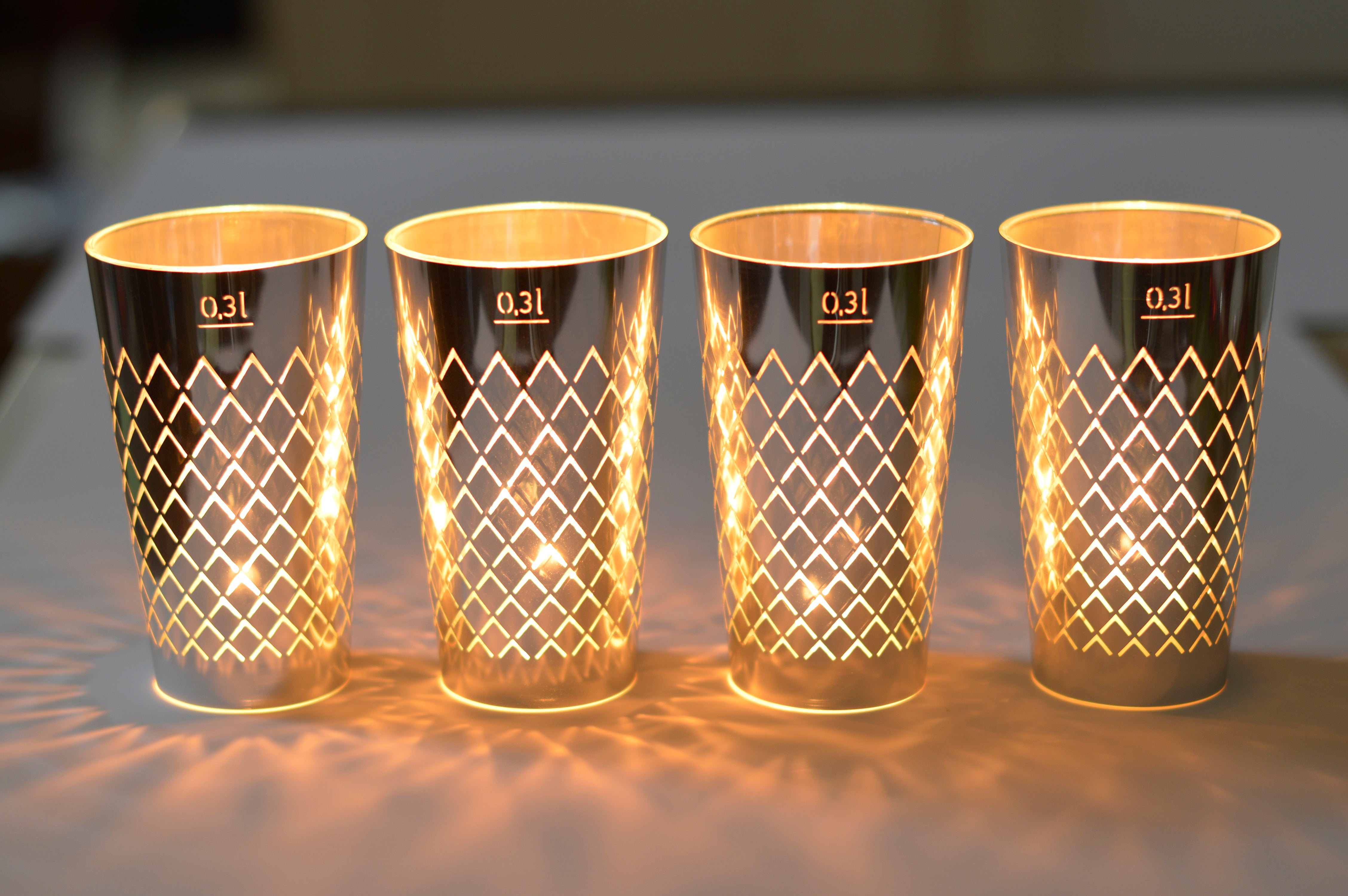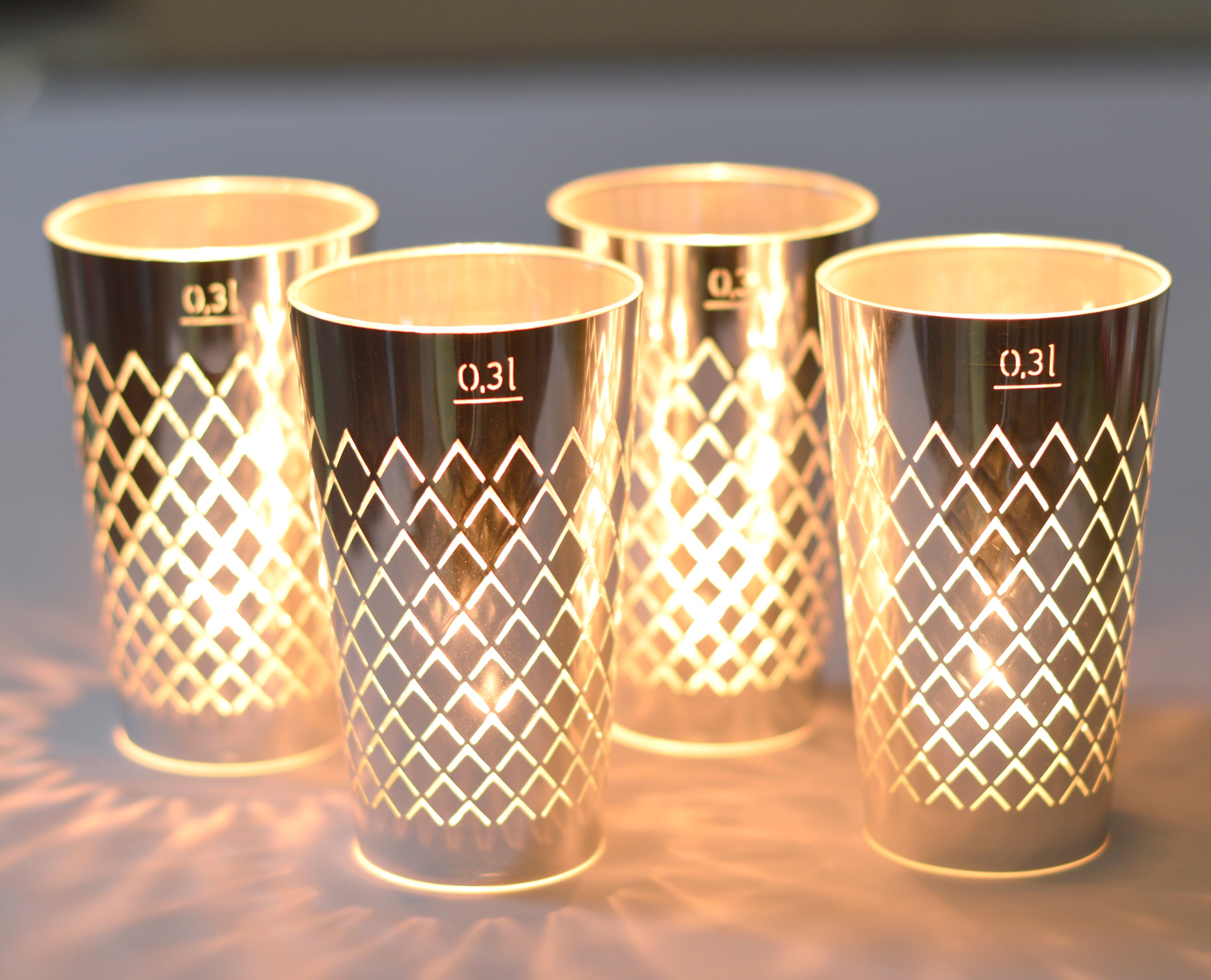 Als Teelichthalter kann ein handelsübliches Teelichtglas oder ein 0,3L oder ein 0,25L Geripptes Glas verwendet werden.