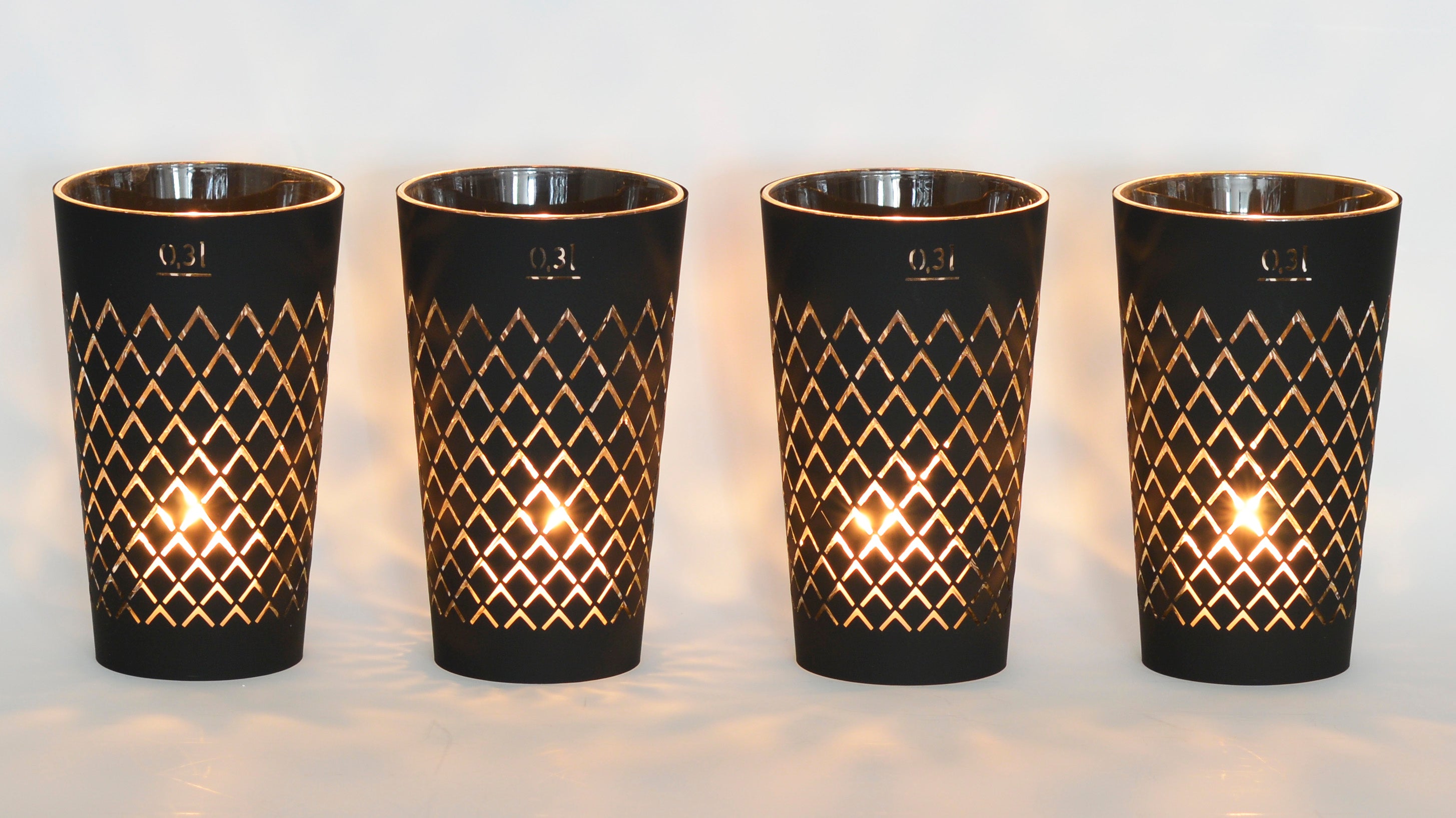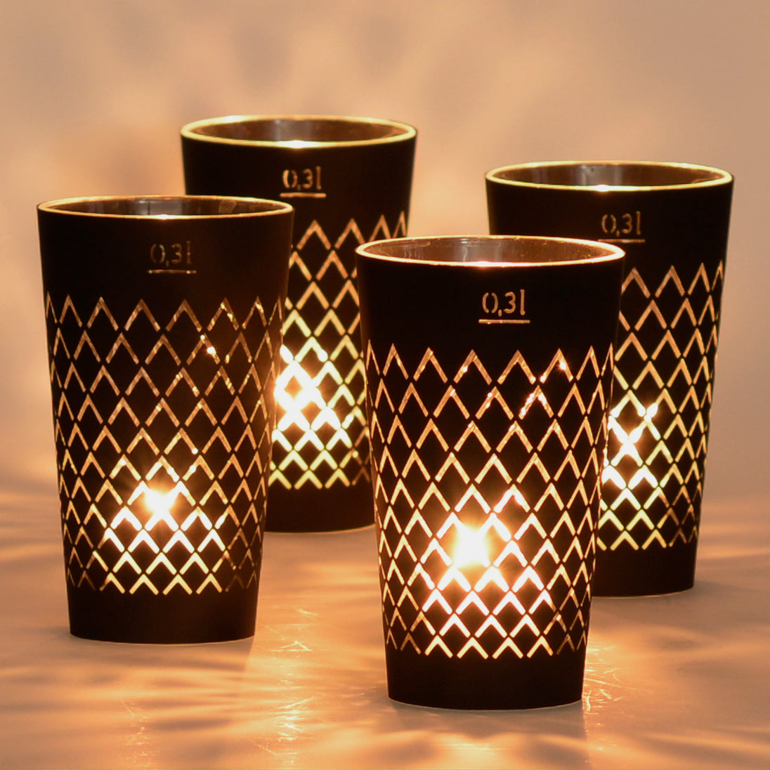Als Teelichthalter kann ein handelsübliches Teelichtglas oder ein 0,3L oder ein 0,25L Geripptes Glas verwendet werden.